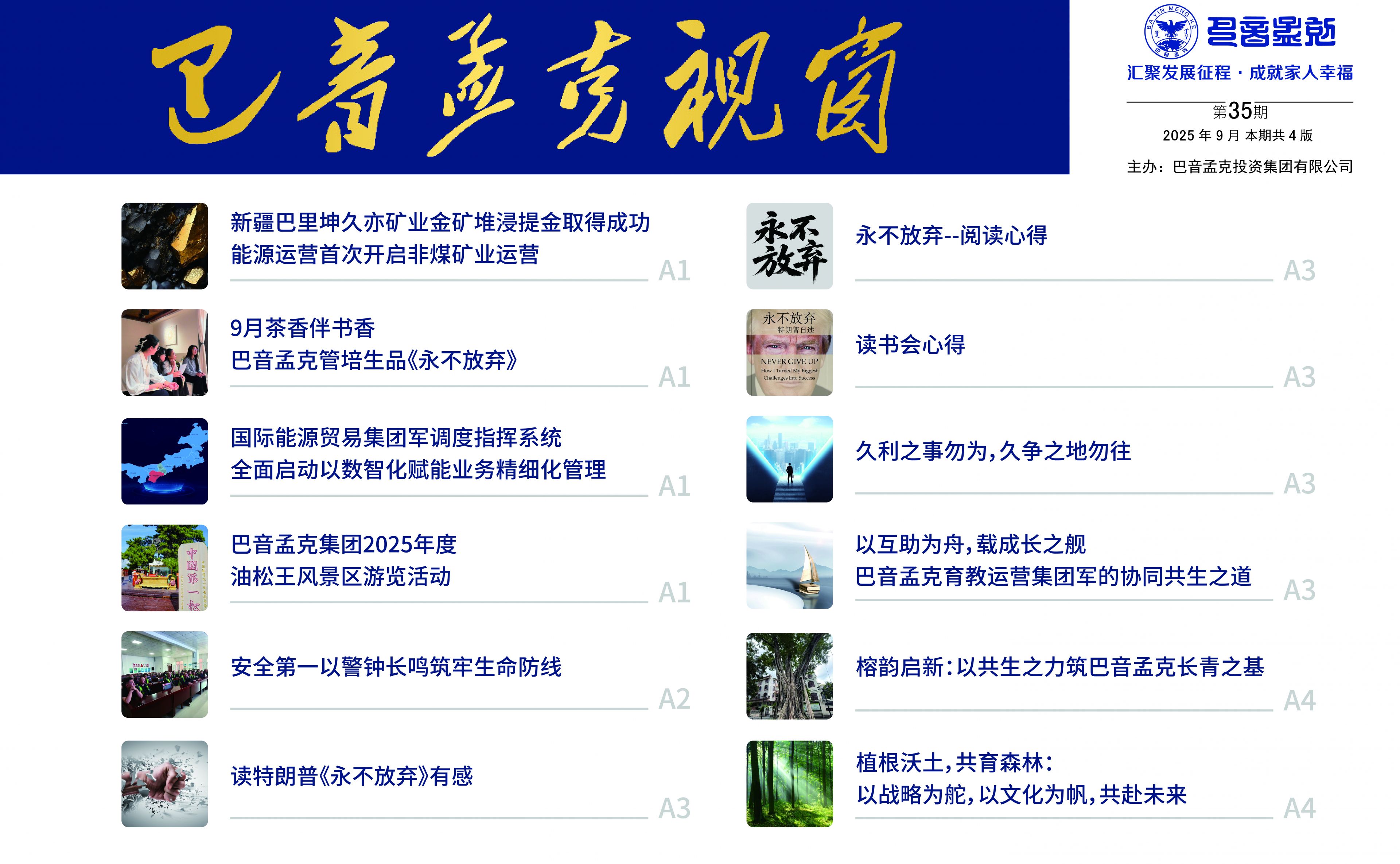新疆巴里坤久亦矿业金矿堆浸提金取得成功能源运营首次开启非煤矿业运营;安全第一以警钟长鸣筑牢生命防线;以互助为舟,载成长之舰 巴音孟克育教运营集团军的协同共生之道;榕韵启新:以共生之力筑巴音孟克长青之基;根植沃土,共育森林:以战略为舵,以文化为帆,共赴未来